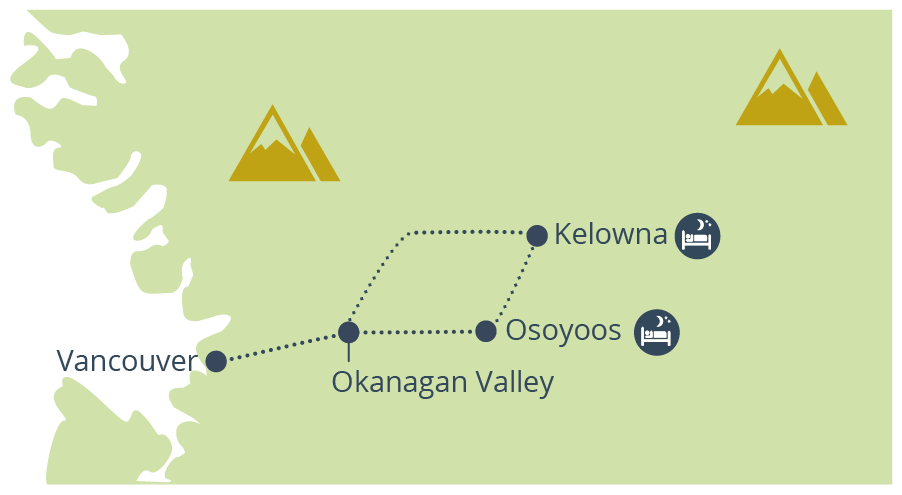 You’ll stay in comfortable, well-located hotels in Osoyoos and Kelowna, close to local attractions, dining, and lakefront areas.